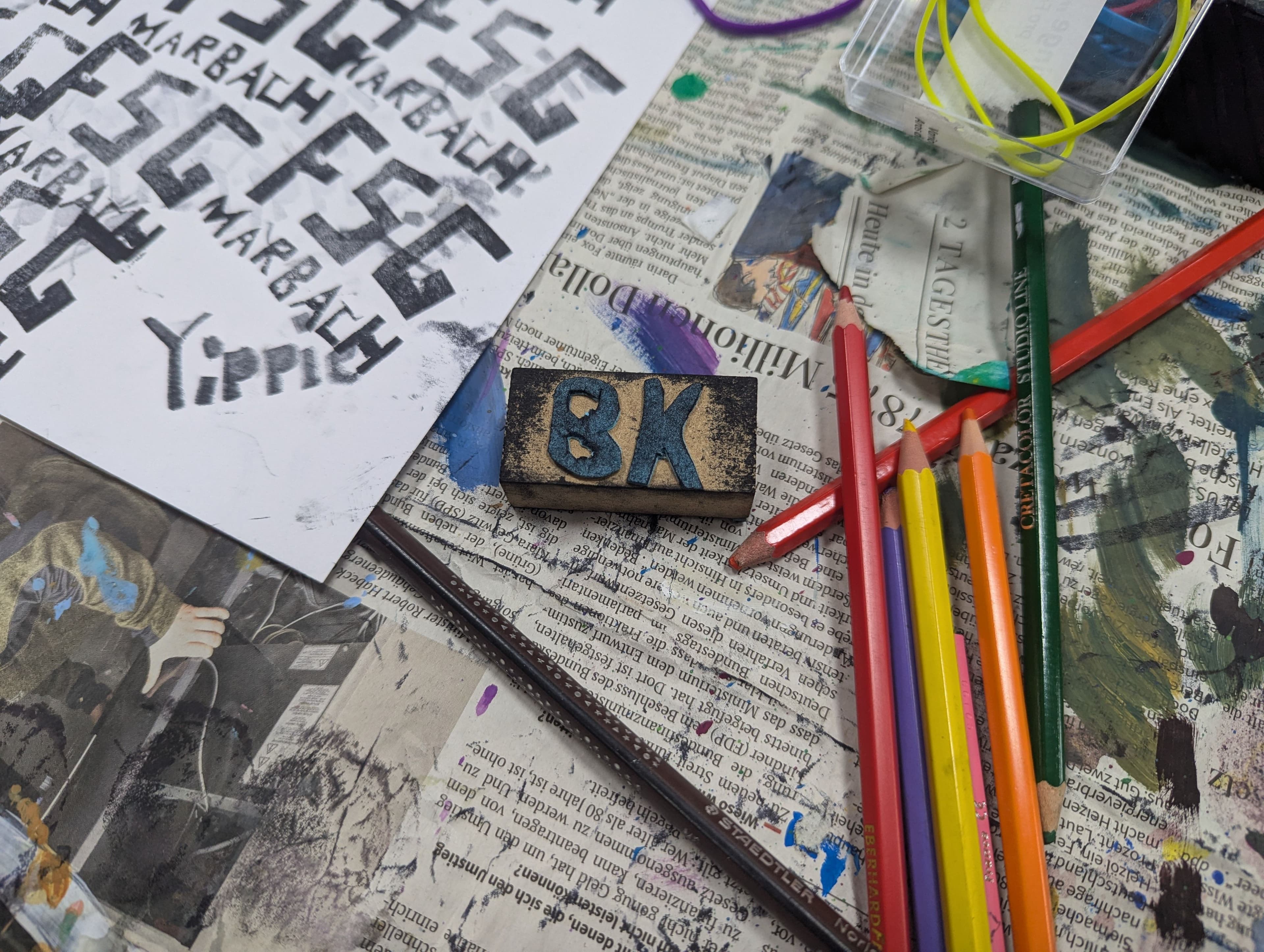gefaltete Papprollen, die zu Gesichtern umgestaltet wurden , liegen auf einem Tisch. Im Hintergrund ist eine Kunstraum mit unscharfen Menschen abgebildet.